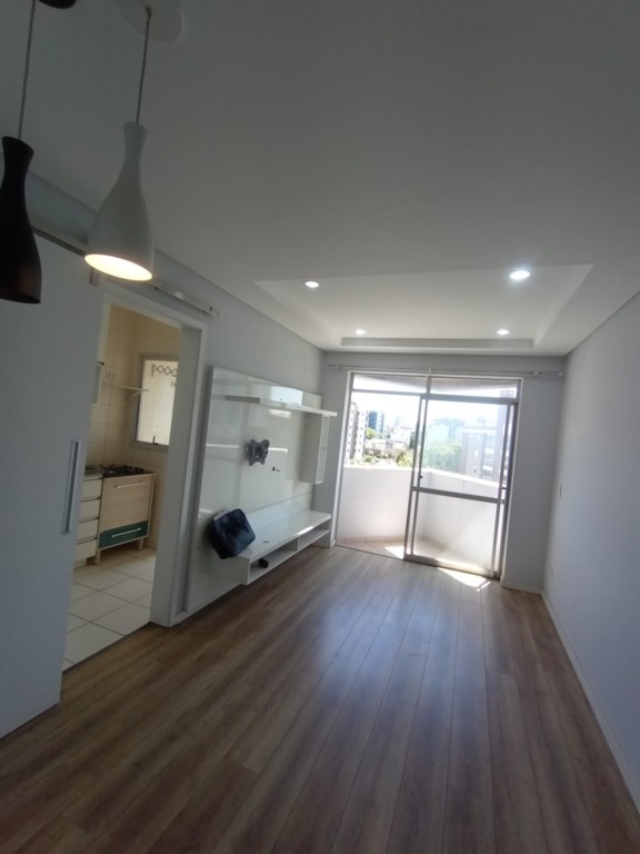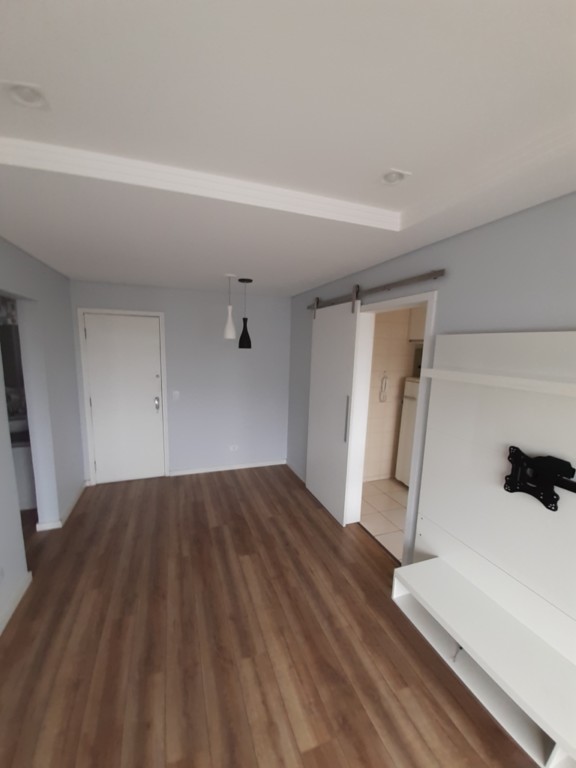 Sala com painel laqueado, teto rebaixado em gesso, luminárias modernas, ambiente amplo e claro,