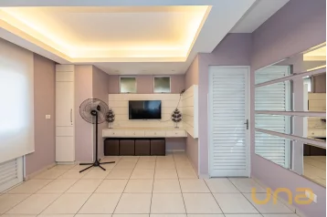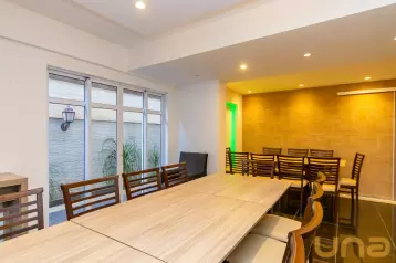 - Sala ampla para dois ambientes, com mesa e 6 cadeiras, mesa de canto com 1 cadeira, painel de TV embutido e lareira.