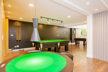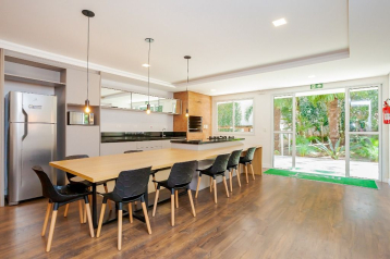 Sala de jantar com mesa e rack;