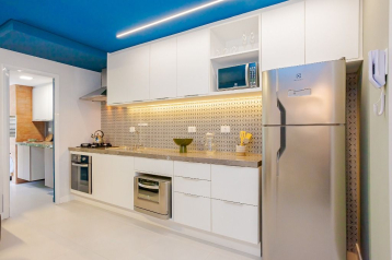 Cozinha com armários, geladeira, fogão, micro-ondas e forno elétrico;
