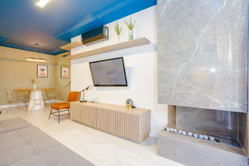 Sala de estar com sofá e painel de Tv;