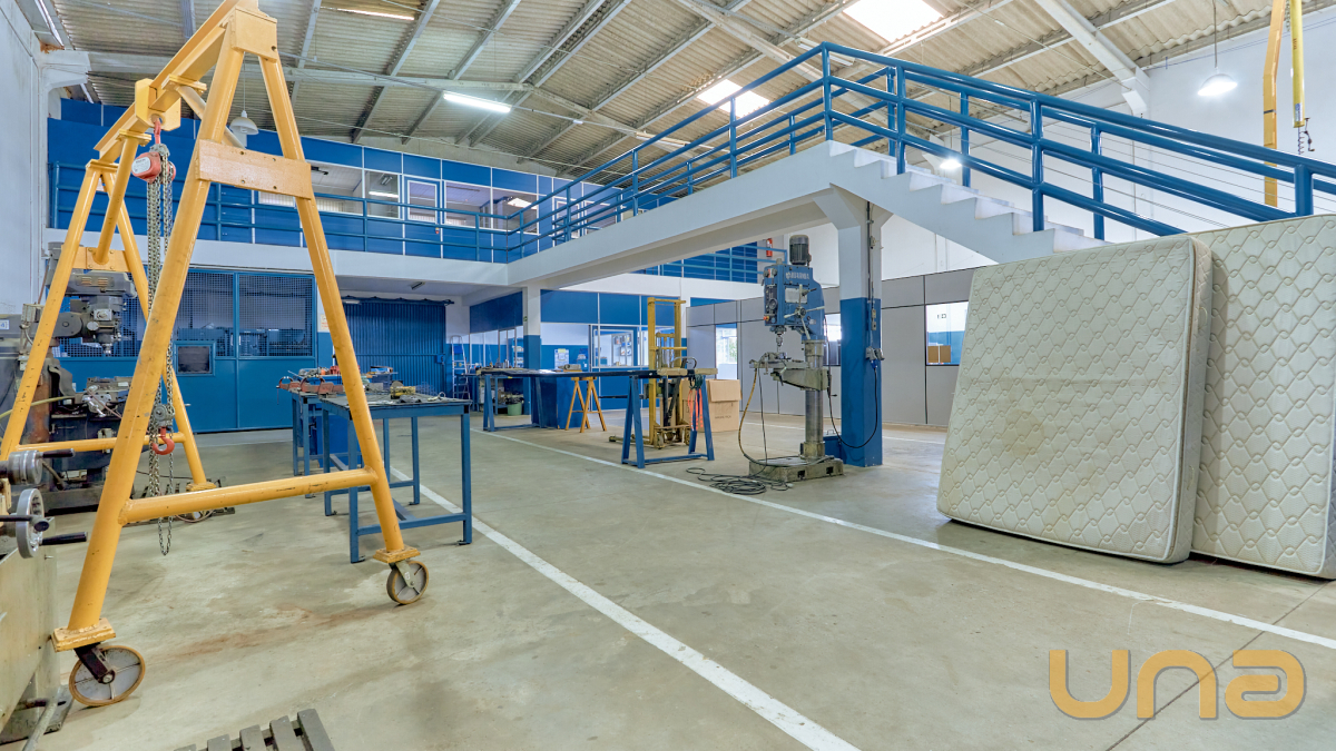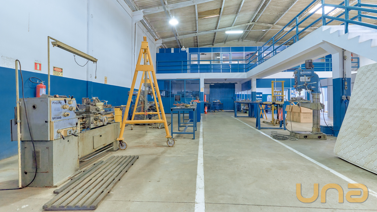 O barracão é composto por diferentes áreas funcionais. No térreo, há uma fábrica que pode ser adaptada para atender às necessidades de diversos tipos de negócios. Esta área oferece um espaço aberto e versátil, permitindo a instalação de equipamentos e maquinários de produção.