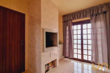 Sala para dois ambientes, com piso cerâmico, lavabo e lareira;